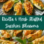 Ricotta & Herb Stuffed Zucchini Blossoms are a light and elegant appetizer featuring delicate zucchini flowers filled with creamy ricotta, fresh herbs, and Parmesan, then fried to golden perfection in a crisp, airy batter. Each bite is fresh, savory, and irresistibly crunchy.